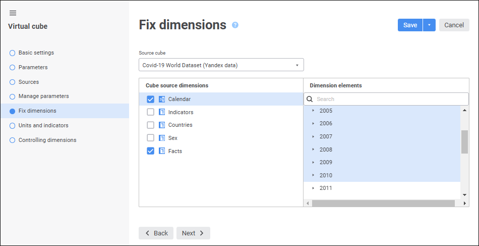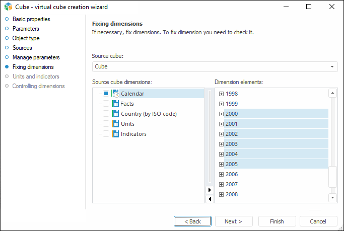 Virtual Cube. The cube is created using the other cube data. A cube fact dimension is created on the selected elements of fixed dimensions. When viewing virtual cube data in an express report, the dimensions panel shows non-fixed shared dimensions of source cubes and the dimension of virtual cube facts: