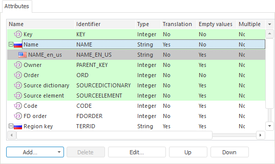 If the Translate Dictionary Into Other Languages checkbox is selected, the icons of attributes of the String and Long Text types requiring translation are replaced with the flag of the country that uses the current translation language as its official language.