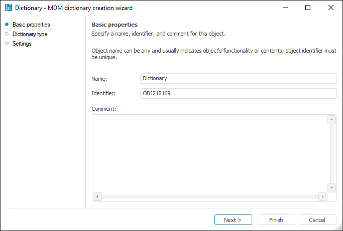 The Basic Settings page in the web application and the Basic Properties page in the desktop application are used to set object name, identifier and comment, and to set up MDM dictionary structure. In the desktop application, MDM dictionary structure setup is available only after a dictionary is created.