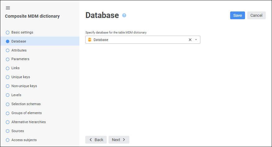 On the Database page in the web application or on the Settings page in the desktop application select the database for storing composite MDM dictionary data.