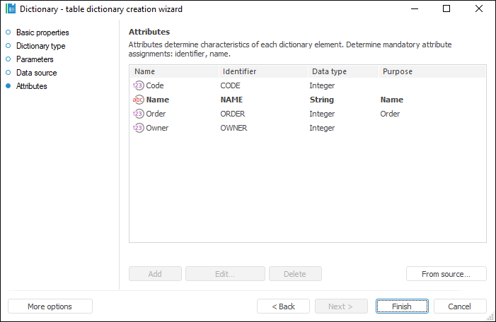 The Attributes page is used to set a list of dictionary attributes and their purpose. The list of attributes determines the set of characteristics of each dictionary element.