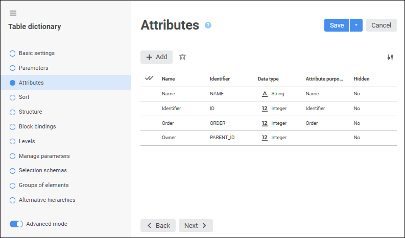 Skip the Parameters page because the dictionary is not parametric. Select the Table Dictionary radio button on the Dictionary Type page, click the More Options button and go to the Attributes page: