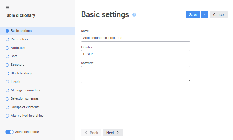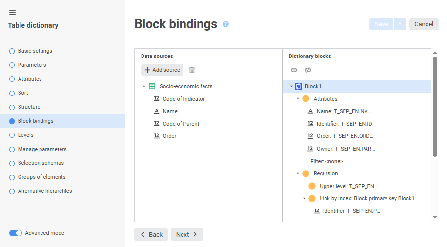 From the schema object list select the Socio-Economic Indicators Dictionary table, which fields should be linked to the dictionary attributes. Bind the fields to the attributes as follows: