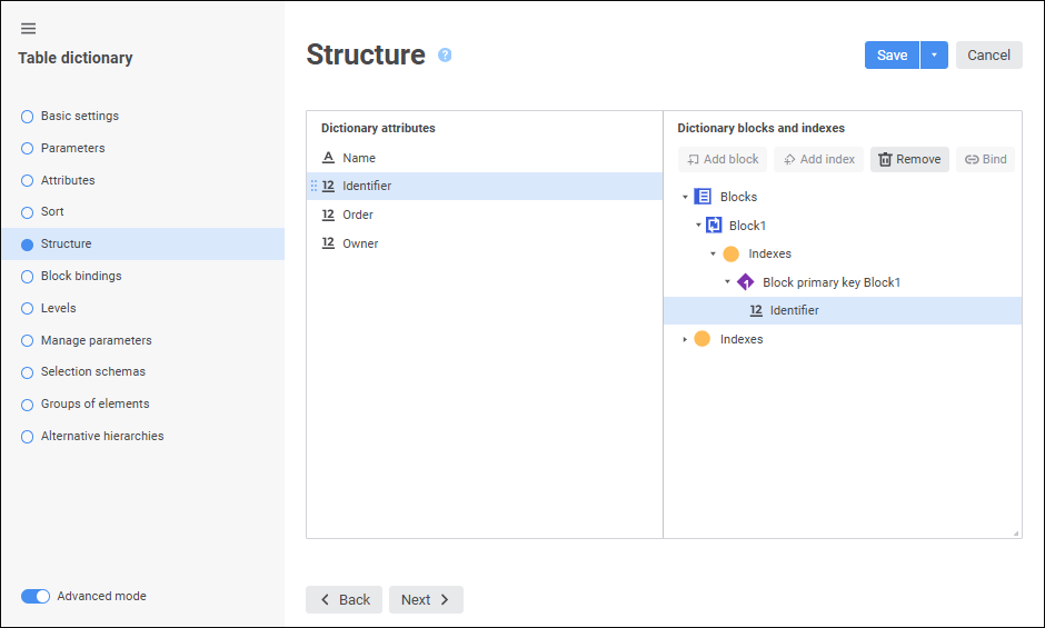 Drag the Identifier dictionary attribute from the dictionary attribute list to the Block Primary Key Block 1 element.