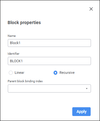 In the Dictionary Blocks and Indexes area select Blocks and click the Add Block button. Select the Recursive radio button in the dialog box that opens and click the OK button: