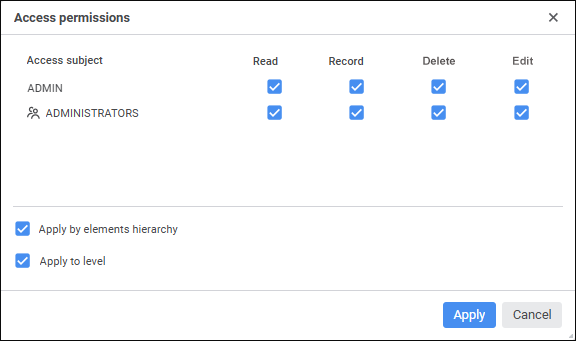 Apply to Level. Selecting the checkbox enables the user to apply access permissions to all elements of the level, to which the configured element belongs.