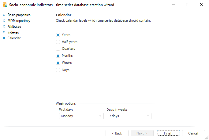 Select checkboxes for all calendar levels to be included in the time series database. If the Weeks level is selected, advanced options are available: