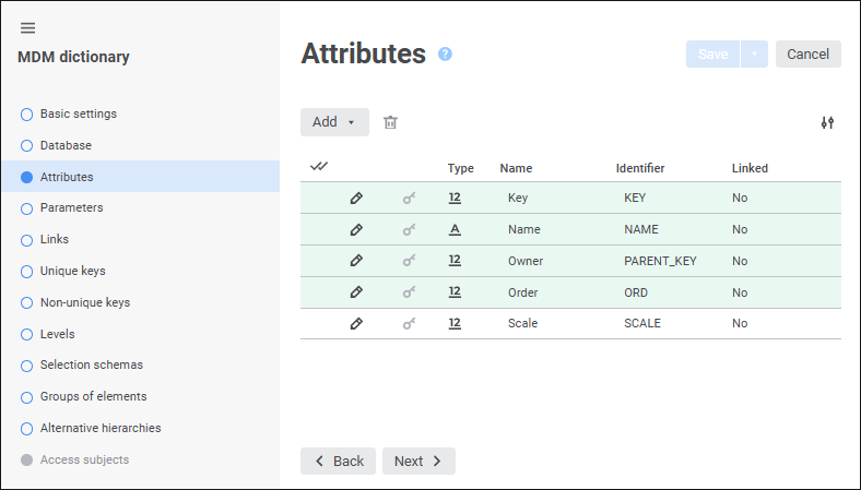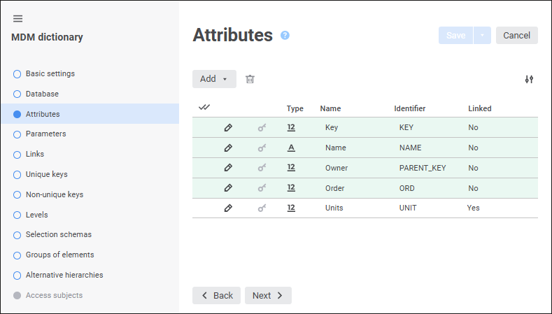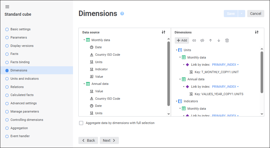 The created dictionaries must be added to the list of cube dimensions on the Dimensions page and must be selected on the Units and Indicators page. Dictionaries may be standard and MDM dictionaries.