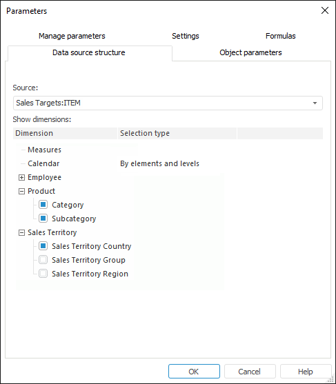 To view and set up selection view or displaying of alternative hierarchies as dimensions in the report, go to the Data Source Structure tab of the Parameters dialog box.