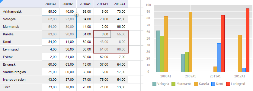 If several cell ranges are selected in the data area table by means of the CTRL key, visualizers get the joined selection by rows and columns by all selected ranges. For example: