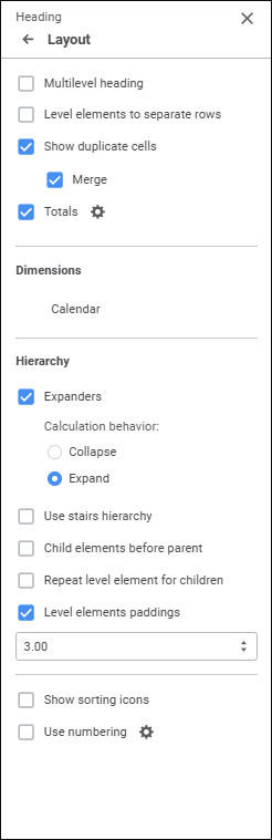 Use Stairs Hierarchy. If several dimensions are located by columns or rows, it is recommended to use stairs hierarchy to separate dimension elements in the sidehead or heading. The checkbox is deselected by default.