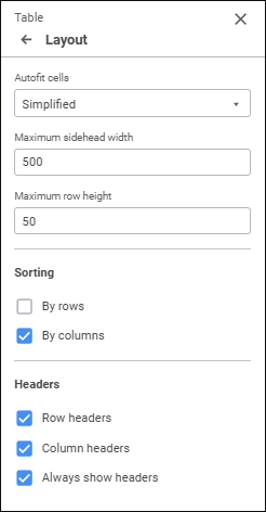 To sort data in table by rows and/or columns, select the corresponding checkboxes By Rows/By Columns for the Table area and Show Sorting Icons for heading and sidehead. After the checkboxes are selected,