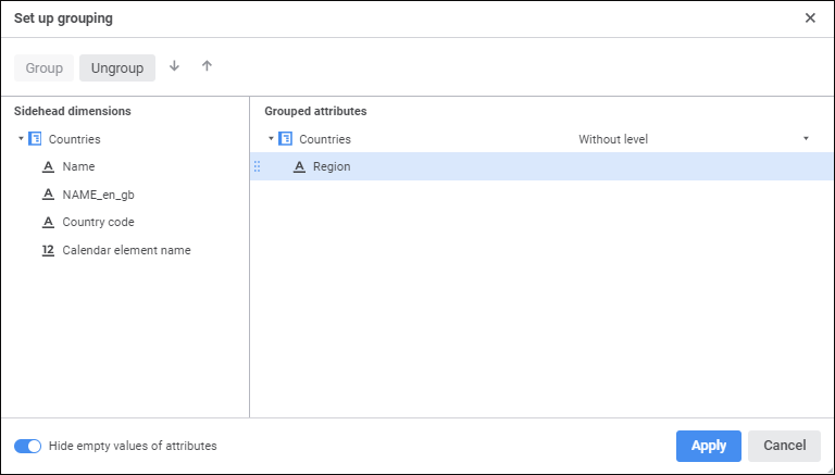 NOTE. Grouping can be set up for each dimension displayed in the sidehead, except for private dimensions, dimensions, which were moved from private ones, dimension, for which alternative hierarchy is set up, dimensions, for which displaying of additional dimensions is set up.