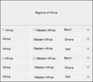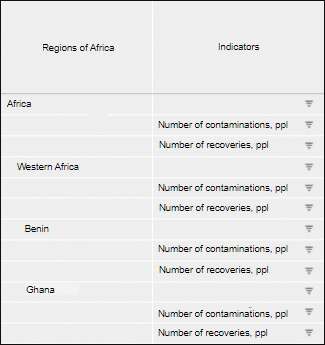 To show or hide duplicate cells in the data table, select or deselect the Show Duplicate Cells checkbox. Duplicate cells are shown by default. If the checkbox is deselected, level name is displayed in a separate row before level elements and in a merged cell opposite to level elements. The table where the Level Elements to Separate Columns checkbox is selected is shown on the left, the table with the Level Elements to Separate Columns and Show Duplicate Cells checkboxes are selected on the right: