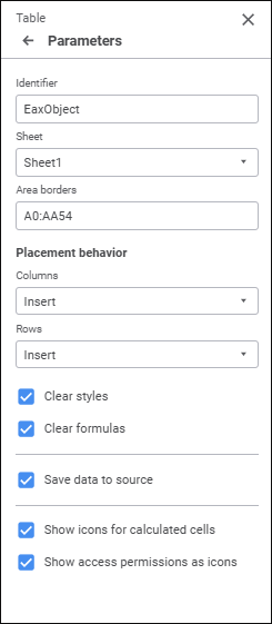 To set up table general parameters, use the Parameters group of parameters on the parameters panel: