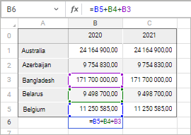 To set or edit active cell value or formula, place the cursor to the formula bar and define a new value or formula. When entering a formula, put the equality sign (=) at the beginning of it. When editing a formula, addresses of the used cells are highlighted with different colors. A cell address color corresponds to the cell color in the working area: