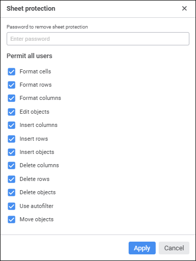 After the actions are selected, click the Apply button. If password was not set, the sheet will be protected from the beginning.