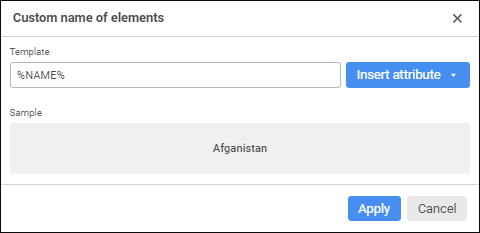 Set name display template using the Insert Attribute button. The drop-down menu of the Insert Attribute button contains dimension attributes.