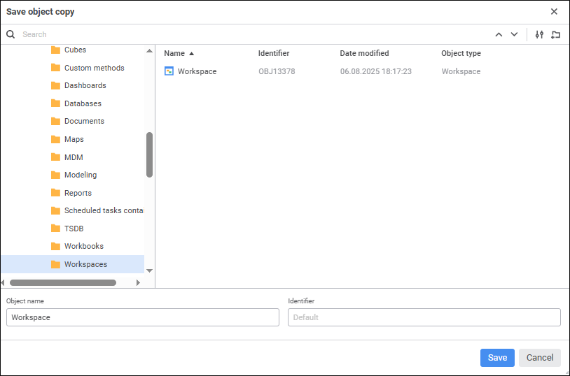 When creating a copy of workspace, a new workspace is created in the repository, which is immediately opened for edit. If an object with the identifier specified in the Save Object Copy dialog box already exists, an attempt to create a workspace copy returns the following:
