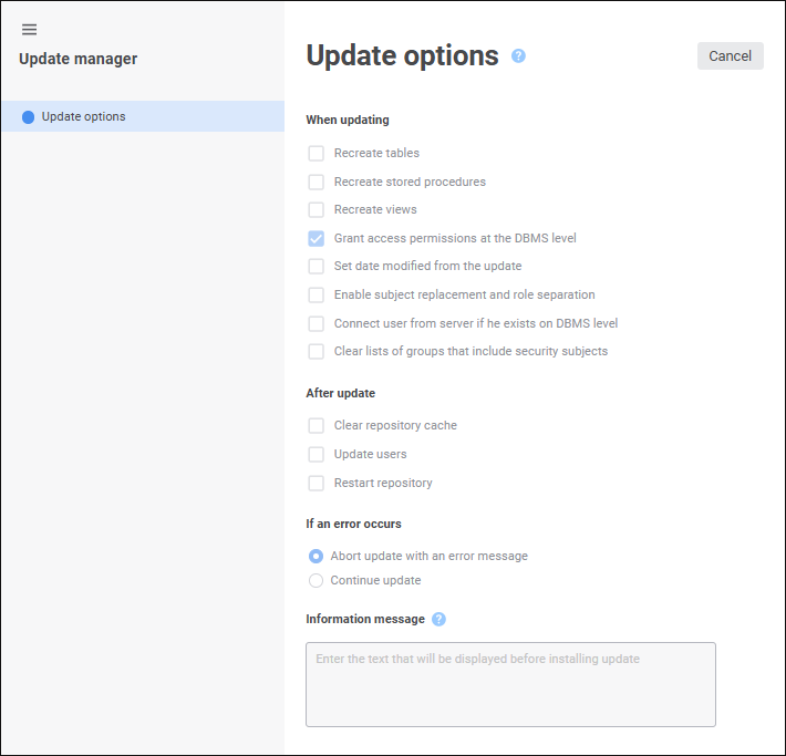 Grant Access Permissions at the DBMS Level. If the access permission transfer for one or several objects has been set up for the update, it may require to update access permissions at the DBMS level. Selecting the checkbox allows for informing the user about installing update and when the positive answer is selected, to update access permissions are on the DBMS level. When the checkbox is deselected on installing update, permissions are applied only at the platform level; to apply access permissions at the DBMS level, update users.