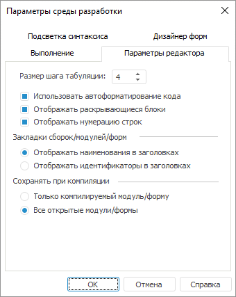 Закладки модулей. Выбирается формат отображения вкладок открытых объектов среды разработки:
