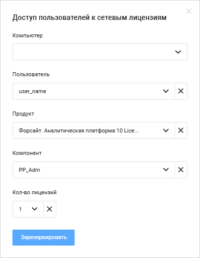 Пользователь. Выберите в раскрывающемся списке имя пользователя, для которого будет зарезервирована единица лицензирования;