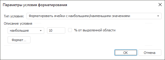 Для настройки форматирования ячеек с наибольшими или наименьшими значениями используйте вкладку «Условное форматирование» на боковой панели или диалог «Параметры условия форматирования».