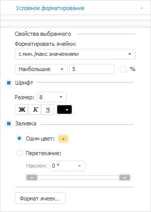 Формат ячеек. Нажмите кнопку для настройки дополнительных параметров форматирования ячеек с определенными значениями. Будет открыт диалог «Форматирование».