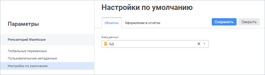 Примечание. В веб-приложении в настройках по умолчанию доступно задание объектов репозитория и настройка оформления в отчётах.