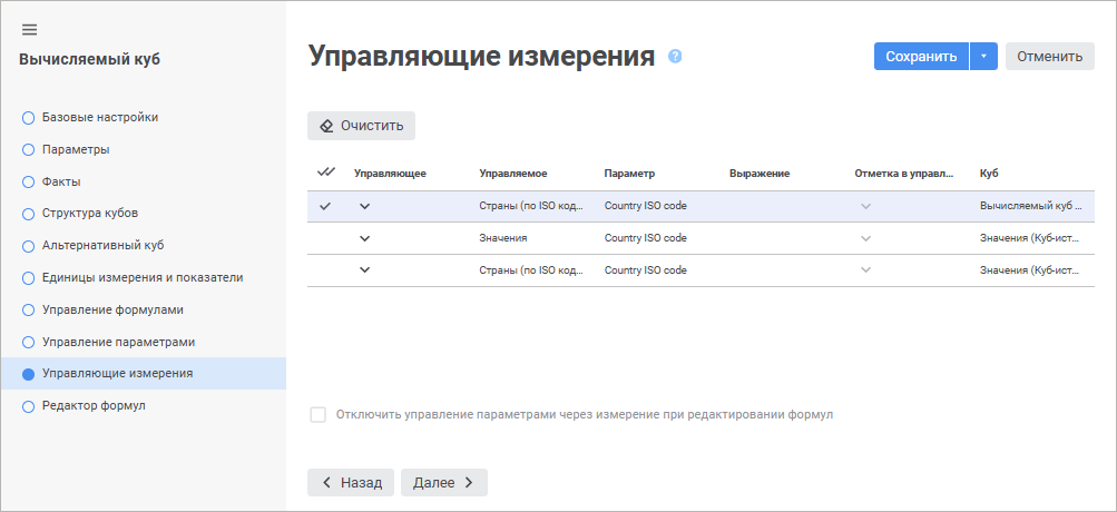 в веб-приложении задайте требуемые параметры в соответствующих столбцах на странице «Управляющие измерения»;