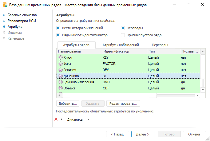 По умолчанию база данных временных рядов уже содержит минимальный набор системных атрибутов рядов и системных атрибутов наблюдений. Они подсвечены зелёным цветом и их удаление запрещено.