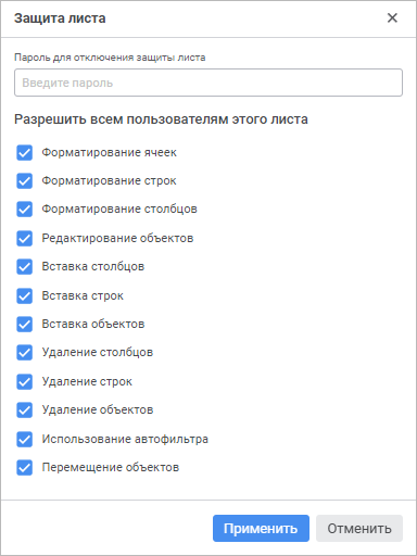 После определения набора действий нажмите кнопку «Применить». Если пароль был не задан, то лист сразу будет защищён.