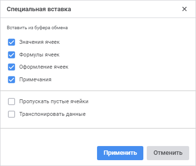 При вставке из буфера обмена будет открыто окно «Специальная вставка»: