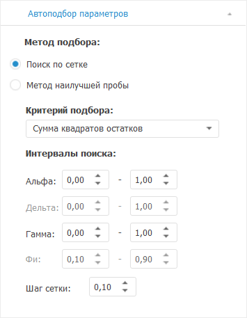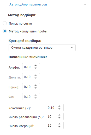 Для настройки параметров автоматического подбора значений коэффициентов в модели экспоненциального сглаживания используйте вкладку «Автоподбор параметров»