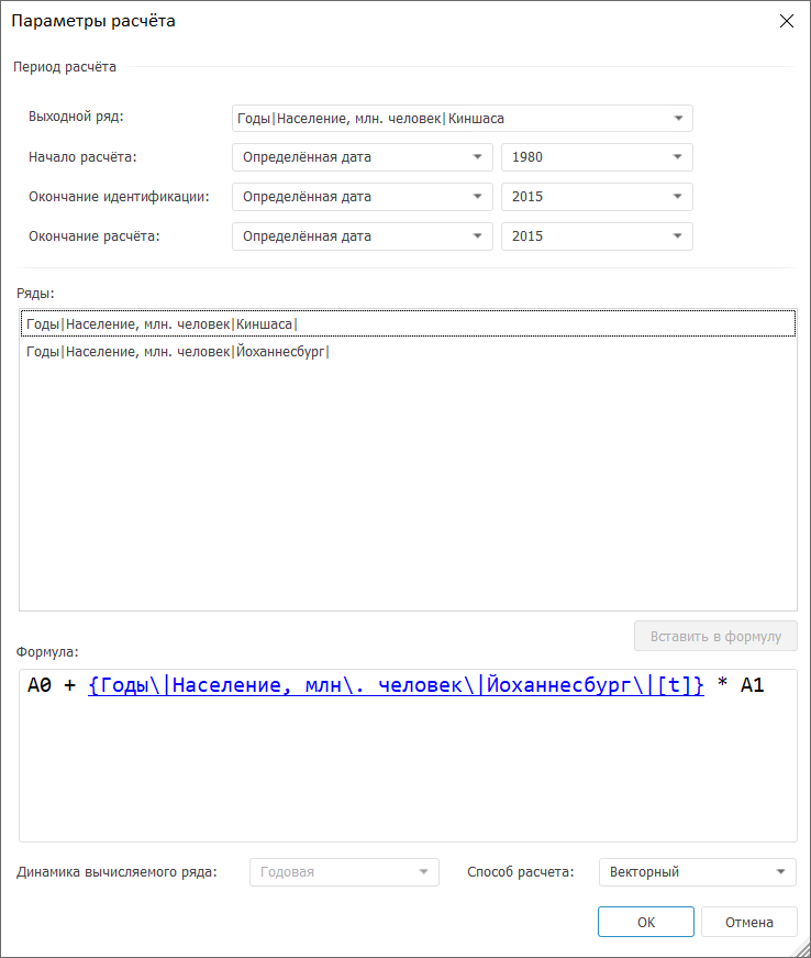 Если формула задана верно, то при нажатии кнопки «OK» окно «Параметры расчёта» будет закрыто, в таблицу данных будет добавлен вычисляемый ряд с наименованием «Нелинейная регрессия(<Список_Объясняющих_Рядов>)», содержащий результаты расчета. Например: