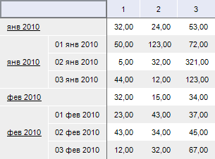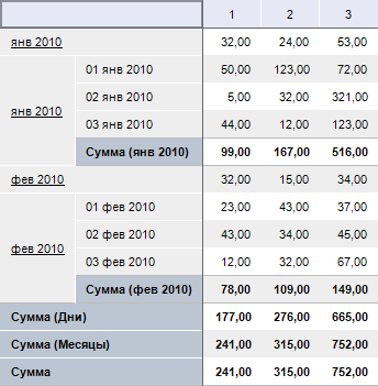При нажатии на кнопку для таблицы по всем уровням измерения, расположенного по строкам, будут рассчитываться итоги: сумма значений.