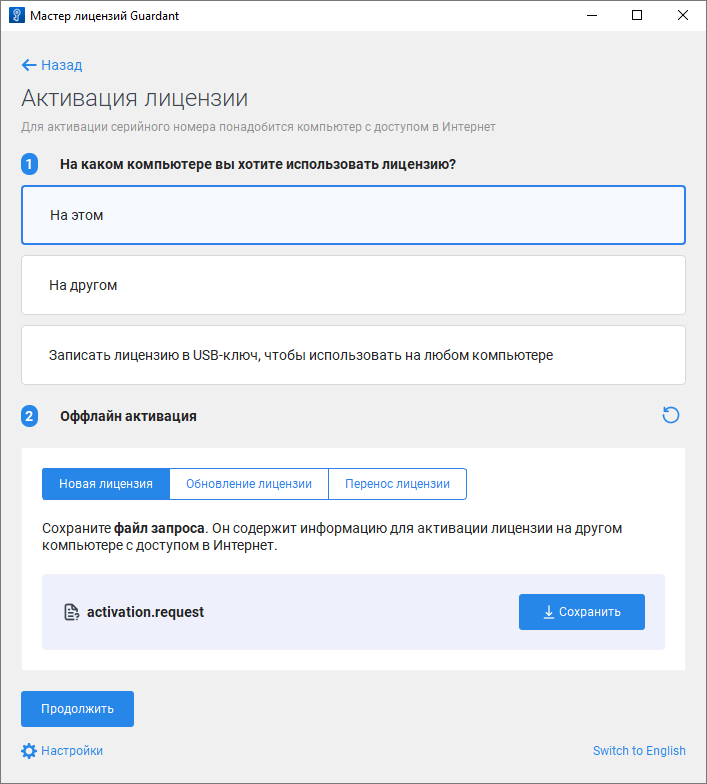 На компьютере с доступом к сети Интернет сформируйте файл лицензии с расширением *.license:
