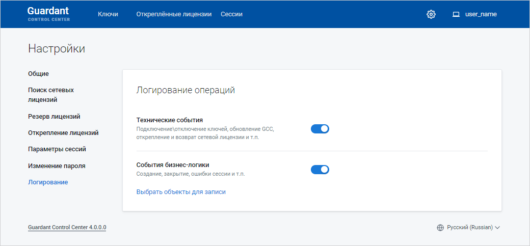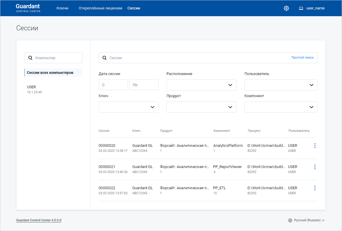 Для работы с лицензией используйте раздел «Ключи». В разделе содержатся лицензии, активированные в мастере лицензий Guardant, с набором единиц лицензирования (компонентов):