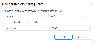 Примечание. Данный фильтр будет недоступен, если в фильтруемых строках отсутствуют числовые значения.