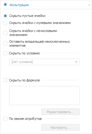 Скрыть по формуле. Будут скрыты строки/столбцы, соответствующие формуле, заданной через «Редактор выражения»;