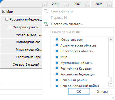 Фильтрация данных позволяет отобразить в таблице только те данные, которые соответствуют заданным условиям. Фильтрация данных доступна для всех визуализаторов. В регламентном отчете доступна быстрая настройка автофильтра.