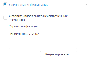 Отдельно для измерения задается фильтрация по формуле, позволяющая исключить элементы, удовлетворяющие формуле, только в выбранном измерении.
