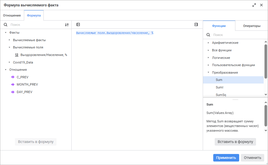 Для применения заданной формулы и закрытия окна «Формула вычисляемого факта» нажмите кнопку «Применить». Сохранённая формула будет отображаться в строке ввода формулы в окне «Создание вычисляемого факта»/«Настройки вычисляемого факта».