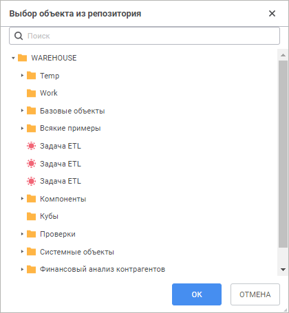 Выберите в открывшемся окне требуемый объект репозитория. Для быстрого поиска объекта начните писать его наименование частично или полностью в строке поиска.
