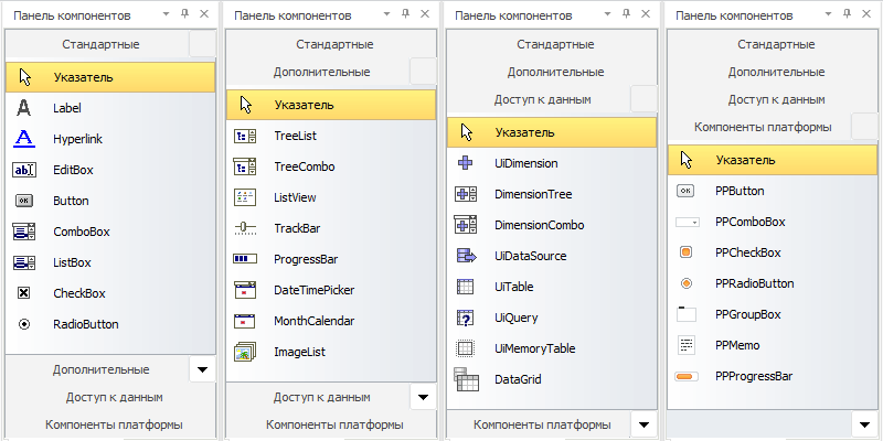 Вкладка «Стандартные» содержит базовые компоненты окон Windows-приложений;