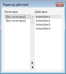 Каждое действие реализуется классом ActionItem и может быть создано динамически в прикладном коде. После создания и настройки свойств действия, его необходимо включить в коллекцию действий компонента ActionList с помощью метода IActionList.AddAction.