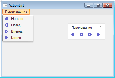 Компонент ActionList позволяет реализовать одинаковые действия для соответствующих пунктов главного меню, контекстного меню, кнопок на панели инструментов и кнопок ленты.