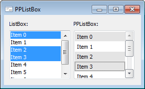 В отличии от ListBox стиль компонента PPListBox не зависит от оформления и настроек операционной системы. Функциональные настройки и возможности компонентов PPListBox и ListBox одинаковые.