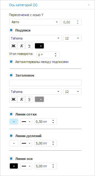 установите флажок «Линия оси» и настройте линию оси: цвет - 0 0 0 в формате RGB, толщина - 5 пт:
