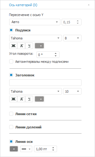 установите флажок «Линия оси» и настройте линию оси: цвет - 128 128 128 в формате RGB, толщина - 1 пт: